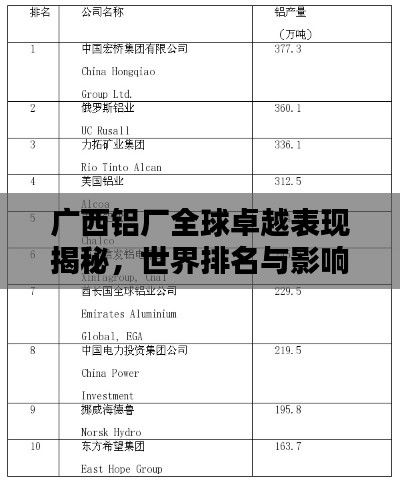转载请注明来自衡水悦翔科技有限公司,本文标题:《广西铝厂全球卓越表现揭秘,世界排名与影响力分析》