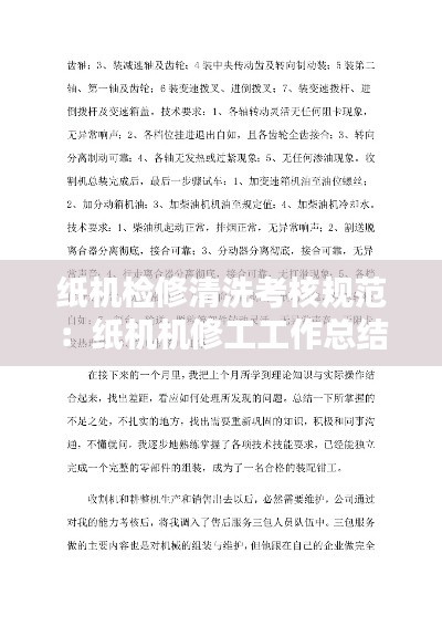 纸机检修清洗考核规范是针对纸机在生产过程中进行检修和清洗作业时,为确保作业安全、提高检修清洗质量而制定的一系列标准和要求。本文将详细阐述纸机检修清洗考核规范的内容,包括考核目的、考核范围、考核方法等。
