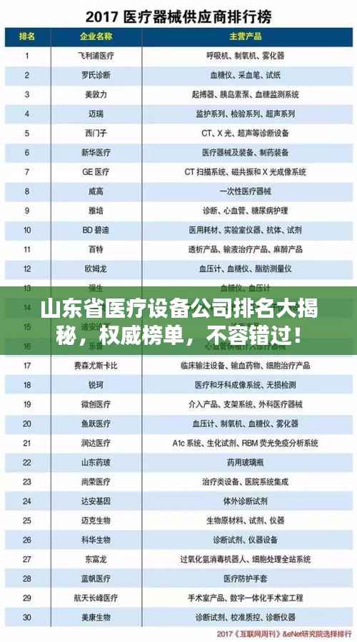 随着医疗技术的不断进步,医疗设备行业也在迅速发展,在山东省,一些医疗设备公司凭借卓越的产品质量、创新的技术和优质的服务赢得了良好的口碑,本文将介绍山东省医疗设备公司的排名,以便为相关人士提供参考。