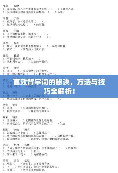 高效背字词需要掌握正确的方法与技巧,如联想记忆法、分解记忆法、词根词缀记忆法等,结合辅助措施如笔记摘抄、多读多写、利用现代科技手段等,可以更快地提高词汇量,希望本文介绍的方法与技巧能帮助大家更好地学习汉语,提高语言应用能力。