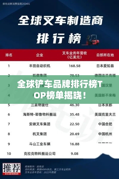 铲车,作为重型工程机械的重要代表,广泛应用于采矿、建筑、道路建设等领域,本文将介绍全球范围内铲车品牌的排名,旨在为读者提供关于世界铲车品牌的信息和参考。